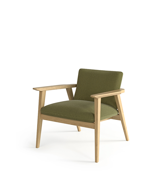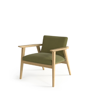 Oblikovanje temelji na kontrastu med geometrijsko, skoraj arhitekturno leseno strukturo in mehko, organsko obliko sedišča. Ta kombinacija daje fotelju edinstven karakter, ki se odlično poda tako v moderne kot tudi bolj tople, naravne interierje.